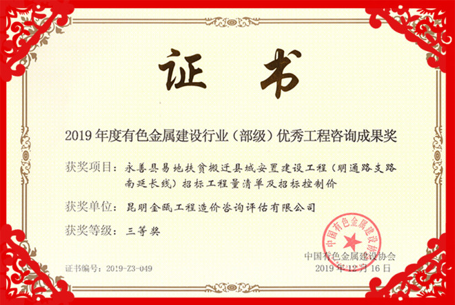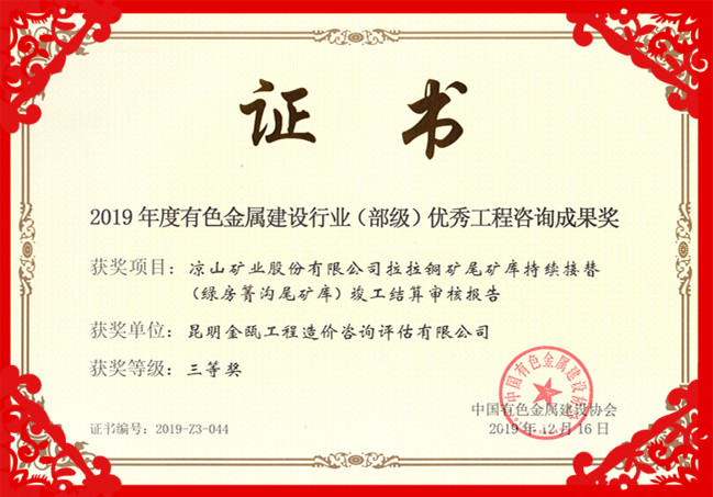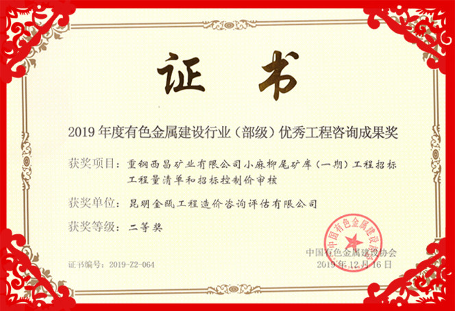 熱烈祝賀昆明金甌工程造價咨詢評估有限公司在2019年度中國有色金屬建設(shè)行業(yè)咨詢成果評獎活動中